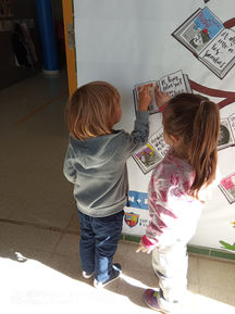 Dos representantes de cada clase han pegado la primera de las 4 piezas del puzle sobre las portadas de los libros. Las demás, se irán pegando en cada una de las efemérides hasta llegar al 16 de diciembre, el Día de la Lectura en Andalucía (fecha en la que publicaremos los vídeo-cuentos y completaremos nuestro mural).